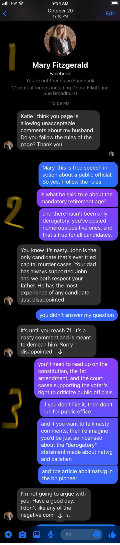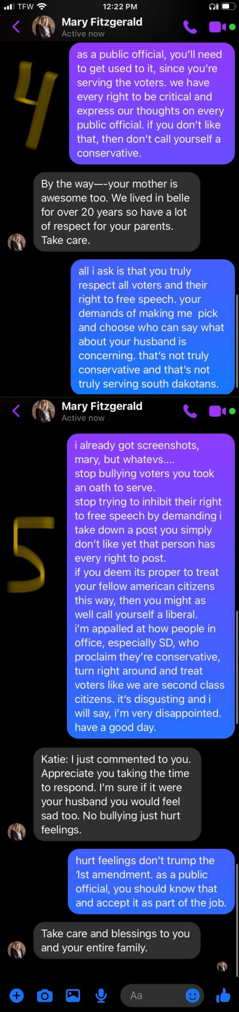 This is an exchange between Mary Fitzgerald, a South Dakota politician, and somebody in her neck of the woods that likely didn’t vote for her.