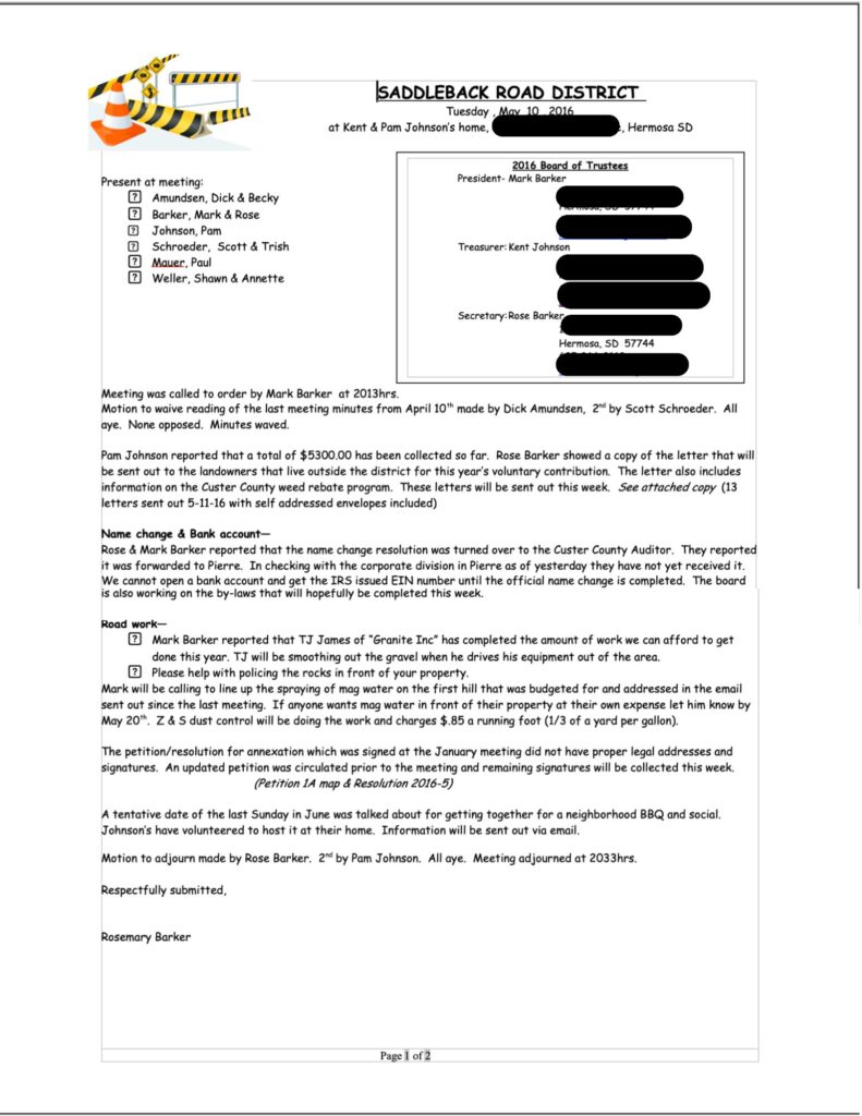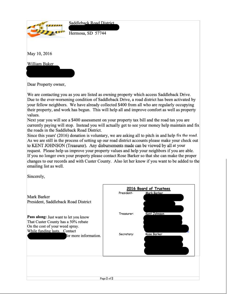 Things to note here (in the letter)- ‘This will help all and improve comfort as well as property values.’ Road districts cannot be used for improvements or increasing property values. Well, not lawfully, but clearly that’s what this one was activated for.