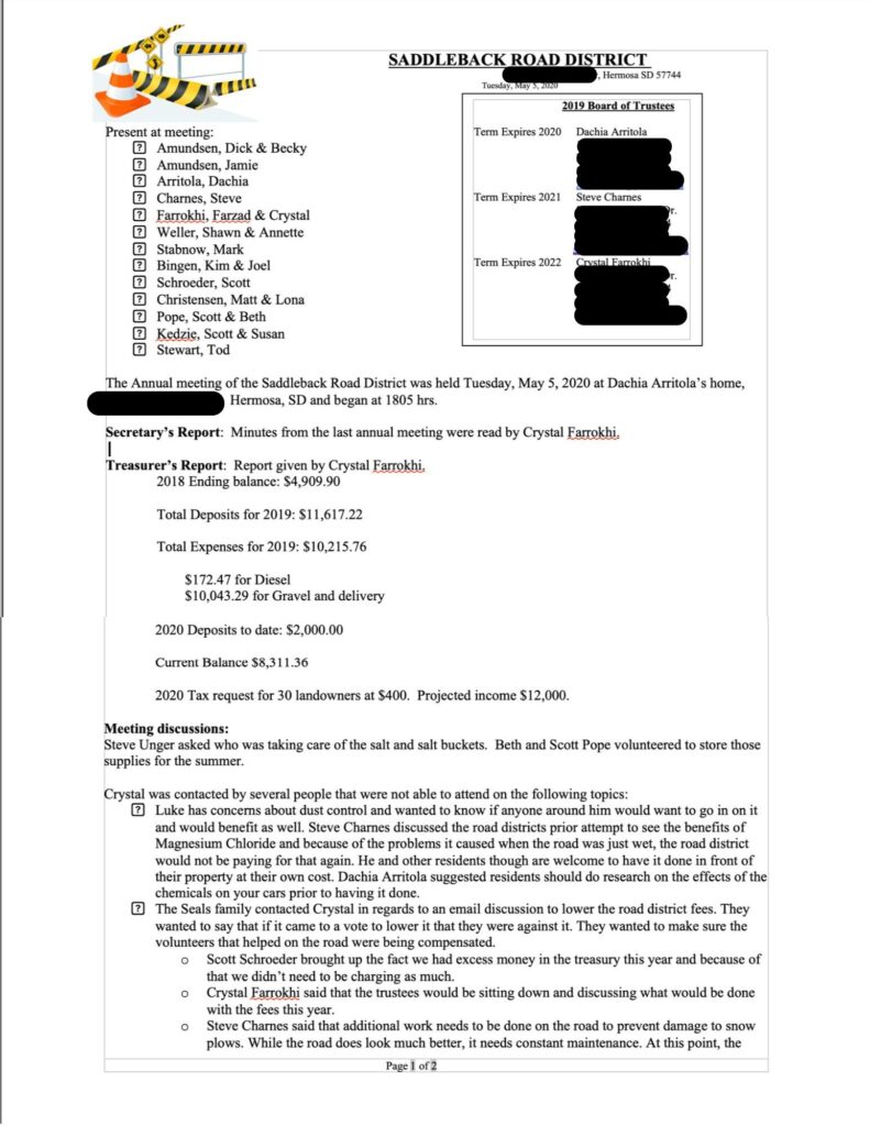 Another Annual Meeting- with no other open meetings between it and the last one. I was stepping down from the board, and had really pushed my neighbor to run, as it was clear to me that the other 2 trustees were ignorant of road repair, and straight up I felt couldn’t be trusted. On the very occasional times when I tried to discuss costs or alternative ideas, I was met with thinly veiled annoyance.